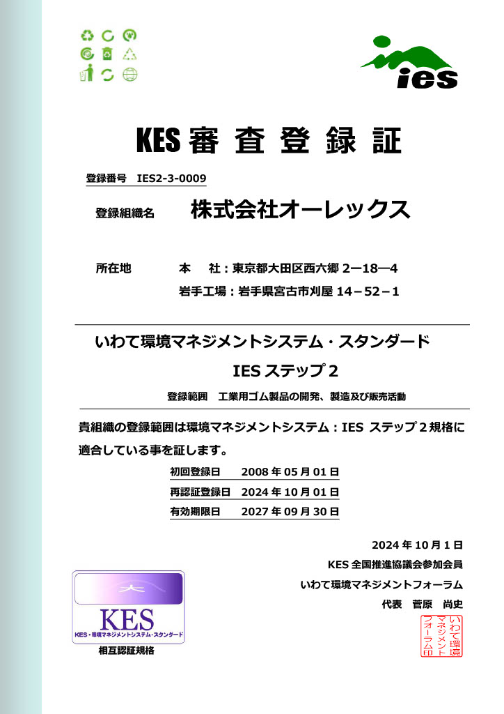 株式会社オーレックスは各種ゴム製品の製造・販売に係る全ての活動・製品及びサービスの環境影響を認識し、地球環境保全に努め継続可能な限り社会に向け、又次世代の希望が持てる環境への負荷が少ないゴムシール・パッキング製品を提供する。油、薬品、水、空気等に着目し、積極的な環境保全に貢献します。